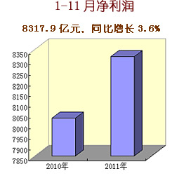 2011年中央企業認真貫徹落實黨中央、國務院各項決策部署,生產經營總體上保持平穩較快增長,主要經濟指標創歷史新高。1-11月,累計實現營業收入18.4萬億元,同比增長22.6%;累計實現凈利潤8317.9億元,同比增長3.6%;上交稅金1.52萬億元,同比增長24.8%,增速比營業收入高2.2個百分點,比凈利潤高21.2個百分點;截至11月底,中央企業資產總額達到27.8萬億元,同比增長16.5%;凈資產10.5萬億元,同比增長12.8%。