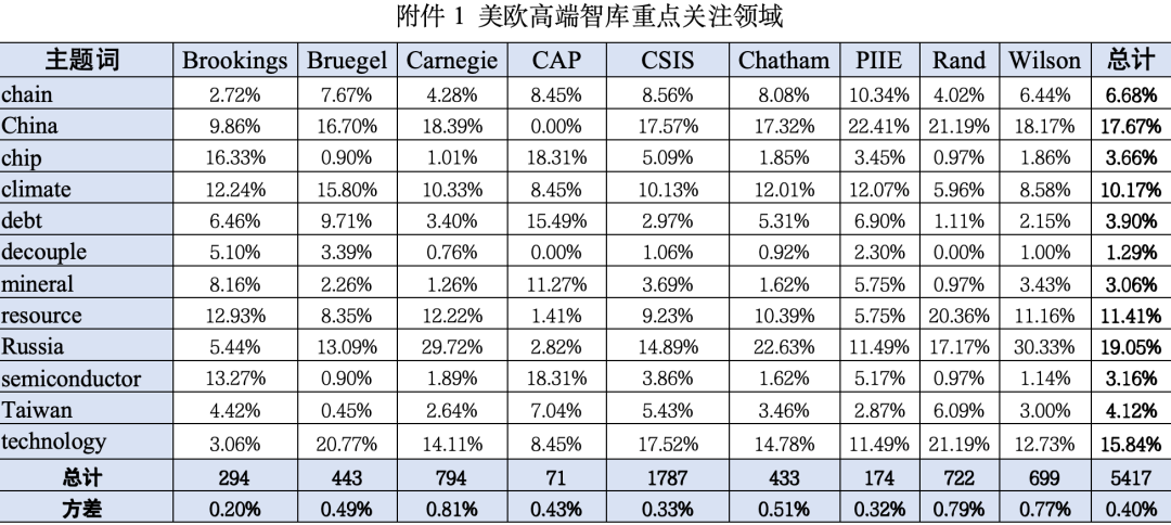 一、研究背景 美歐智庫是全球智庫體系中的重要組成部分,其發(fā)展起步較早,發(fā)展模式較好,行業(yè)規(guī)范更成熟,是美歐國家的重要政策智囊,在全球高端輿論體系中有著重要的地位。總體來看,美歐智庫在數(shù)量和影響力方面處于世界領(lǐng)先地位,其發(fā)布的觀點、分析和評論也成為了當(dāng)下了解美歐國家政府內(nèi)部認(rèn)知和社會公共輿論的一扇重要窗口。 一般對于智庫的研究報告都以文獻(xiàn)閱讀、分析、總結(jié)為主,多針對一篇或幾篇報告進(jìn)行分析。這種研究方式的優(yōu)勢是分析更為透徹和深入,但是由于個人精力、關(guān)注方向的局限性,容易陷入“信息繭房”,對整體方向的把握比較散亂。本報告屬于美歐智庫成果大數(shù)據(jù)研究系列,旨在持續(xù)跟蹤美歐智庫研究動向,更全面了解美歐國家對國際政治、經(jīng)濟(jì)貿(mào)易、中國發(fā)展等關(guān)鍵領(lǐng)域的認(rèn)知情況。 二、樣本選取 研究樣本選取美國布魯金斯學(xué)會(Brookings)、美國卡內(nèi)基國際和平基金會(Carnegie)、比利時布魯蓋爾研究所(Bruegel)、美國戰(zhàn)略與國際問題研究中心(CSIS)、英國皇家國際事務(wù)研究所(Chatham)、美國蘭德公司(Rand)、美國彼得森國際經(jīng)濟(jì)研究所(PIIE)、威爾遜中心(Wilson)和美國進(jìn)步中心(CAP)等9家智庫。 樣本報告研究覆蓋關(guān)于中國、產(chǎn)業(yè)鏈、芯片、氣候、債務(wù)、脫鉤、礦物、資源、俄羅斯、半導(dǎo)體、臺灣、技術(shù)等相關(guān)領(lǐng)域的研究報告,共計5417篇。 三、文本數(shù)據(jù)分析 (一)各智庫關(guān)注領(lǐng)域 2023上半年,各歐美智庫與中國、俄羅斯等相關(guān)的主題報告占比在五分之二左右,與供應(yīng)鏈、芯片產(chǎn)業(yè)、半導(dǎo)體產(chǎn)業(yè)、礦產(chǎn)產(chǎn)業(yè)、脫鉤等相關(guān)的主題報告占比在五分之一左右,與氣候、資源、債務(wù)等相關(guān)的主題報告占比約五分之一,與臺灣、科技主題相關(guān)的報告約占五分之一。不同主題下智庫關(guān)注的重點領(lǐng)域分析參見附件1。 1.布魯蓋爾:中國和科技 布魯蓋爾研究所注重中國問題和科技前沿產(chǎn)業(yè)的研究。在限制中國科技發(fā)展的問題上,布魯蓋爾指出,越來越多的研究員擔(dān)心美國在基礎(chǔ)研究方面的開放可能過于支持競爭對手。隨著科技水平在一些關(guān)鍵領(lǐng)域取得的重大突破、全球化信息環(huán)境的形成、以及國際經(jīng)濟(jì)聯(lián)系的深化和多樣化,各國的相互依存將不可分離,高技術(shù)產(chǎn)業(yè)針對某一國家和地區(qū)進(jìn)行全面封鎖將愈加困難。在科技前沿產(chǎn)業(yè)研究中,布魯蓋爾對由國防部、聯(lián)合作戰(zhàn)指揮部、海軍、海軍陸戰(zhàn)隊、國防機(jī)構(gòu)和國防情報部門聯(lián)合資助的蘭德公司國防研究所進(jìn)行了重點分析,認(rèn)為美國應(yīng)繼續(xù)通過軍工聯(lián)合體推進(jìn)前沿科技轉(zhuǎn)化的研究工作。 2.布魯金斯:芯片和資源 布魯金斯學(xué)會的研究領(lǐng)域較為廣泛,其研究相對側(cè)重芯片和資源。布魯金斯認(rèn)為美國利用其在國際組織如多邊開發(fā)銀行中的股權(quán)影響力,支持美國在外交、安全和經(jīng)濟(jì)方面的政策和活動,特別是對芯片技術(shù)的封鎖。布魯金斯通過對關(guān)鍵礦產(chǎn)供應(yīng)問題的大量分析,如美國和日本宣布的關(guān)于電池礦物采購、美國對加拿大礦業(yè)項目的融資貿(mào)易協(xié)議,提出應(yīng)加強(qiáng)關(guān)注部分關(guān)鍵產(chǎn)業(yè)供應(yīng)鏈上游礦產(chǎn)品,目前美國部分利益團(tuán)體已經(jīng)加強(qiáng)該類產(chǎn)品的供應(yīng)安全,對相關(guān)風(fēng)險有所警惕和防范。 3.卡內(nèi)基:中國和俄羅斯 卡內(nèi)基國際和平基金會的研究具有鮮明的特色,以俄羅斯、中國問題為研究重點,相關(guān)報告約占其研究報告總量的一半。針對俄羅斯,卡內(nèi)基提出目前正在美國執(zhí)行的三大舉措包括加強(qiáng)對烏克蘭的戰(zhàn)爭支持、維持對俄羅斯的制裁和加強(qiáng)北約的東部防線,成功搭建了遏制俄羅斯發(fā)展的政策框架,未來應(yīng)立足這三大核心進(jìn)一步強(qiáng)化對俄政策。圍繞烏克蘭提出的《基輔安全協(xié)議保障草案》,美國仍在權(quán)衡是否將目前的支持轉(zhuǎn)化為更持久的框架。卡內(nèi)基提出,美國對烏克蘭的軍事援助已經(jīng)在美國政府內(nèi)部產(chǎn)生爭議,特別是美國總統(tǒng)選舉即將到來的窗口期日益臨近,各個候選人團(tuán)隊會在這段時間重新研究對烏援助計劃,以爭取選民和國內(nèi)各勢力的最大限度支持。針對中國,卡內(nèi)基多名研究員提出拜登政府的國家安全戰(zhàn)略將中國作為最重要的地緣政治挑戰(zhàn),未來會加強(qiáng)澳大利亞、英國和美國組成的三方安全伙伴關(guān)系,將其逐步培養(yǎng)成印太地區(qū)最強(qiáng)大的軍事力量之一。 4.蘭德:中國、俄羅斯和科技 蘭德公司延續(xù)了其對中國、俄羅斯和科技前沿的關(guān)注。蘭德重點分析和權(quán)衡了中俄戰(zhàn)略地位,雖然短期內(nèi)美國由于烏克蘭戰(zhàn)爭而全面回歸歐洲安全事務(wù),但是長期來看美國的戰(zhàn)略關(guān)注重點仍然是中國。同時,部分研究提出對烏克蘭的援助不僅是