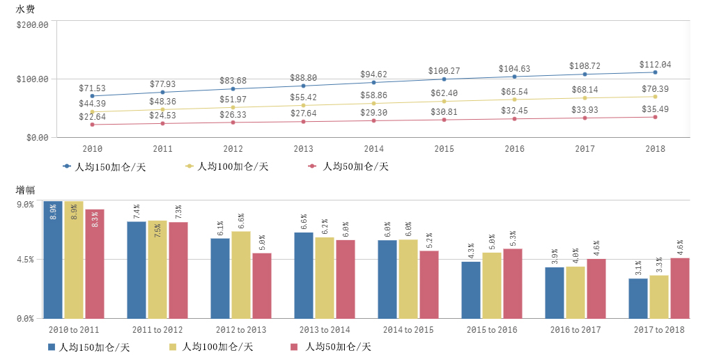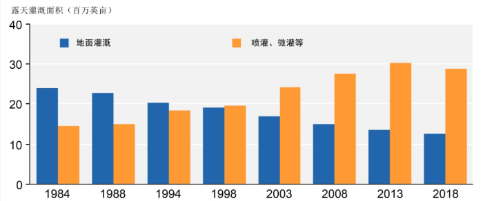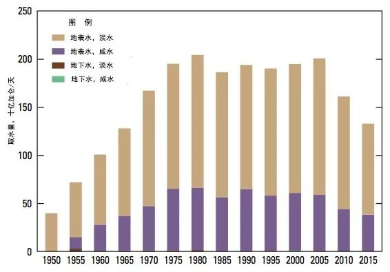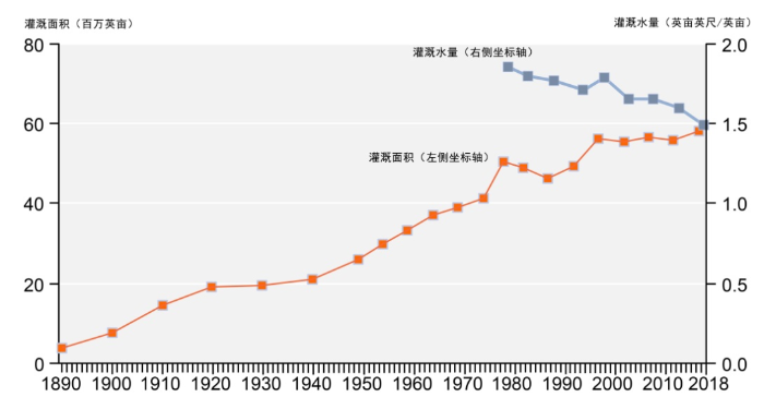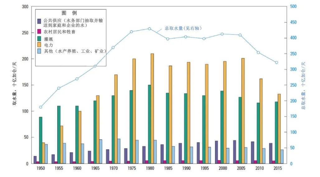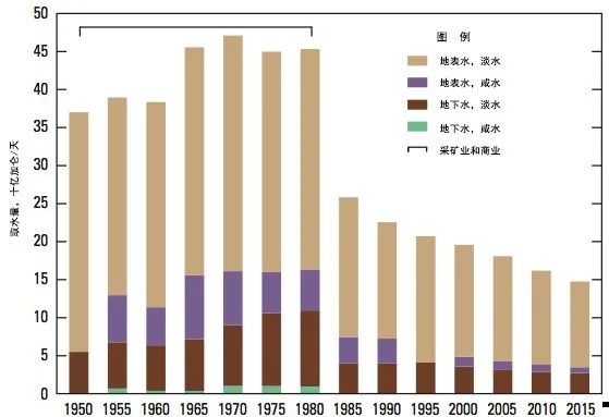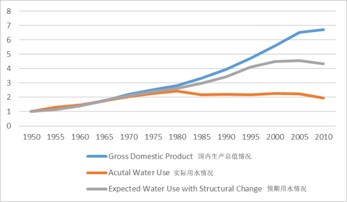 編者按:《2021年聯(lián)合國世界水發(fā)展報告》提出,全球新水使用量在過去100年中增加了6倍,自20世紀80年代以來以每年約1%的速度增加。預(yù)計至2050年全球用水量仍將以類似的速度繼續(xù)增長,且增長主要集中在中低收入國家,尤其是新興經(jīng)濟體[1]。 為進一步把握好我國水資源未來需求趨勢,我們深入分析研究了一些典型國家的用水態(tài)勢變化情況及水資源管理經(jīng)驗,以期為我國做好水資源需求研判以及科學指導(dǎo)水工程規(guī)劃建設(shè)提供參考。本公眾號將研究成果以系列文章的方式陸續(xù)刊發(fā),本文為系列研究之一,供業(yè)界同仁參考。 美國用水變化態(tài)勢對我國的啟示 姜富華 邢智慧 紀興華 一、1950年以來美國用水量變化態(tài)勢分析 (一)1950年以來美國用水量變化情況 2015年美國總用水量約為4449億立方米,其中淡水約為3883億立方米,占比為87%;咸水約為566億立方米,占比為13%。 從1950年至2015年間美國總用水量的變化情況看,其總體呈先增后降的態(tài)勢(見圖1)。以1980年為轉(zhuǎn)折點,1950-1980年間美國總用水量隨著人口和經(jīng)濟的增長持續(xù)增長,1980年美國總用水量約為1950年的2.4倍;1980年以后,受產(chǎn)業(yè)結(jié)構(gòu)調(diào)整、技術(shù)進步、用水效率提高等因素綜合影響,美國總用水量呈現(xiàn)了總體下降的態(tài)勢,2015年總用水量比用水高峰的1980年減少了約25%。 美國淡水取用量與總用水量變化態(tài)勢一致(見圖2)。1980-2015年間美國淡水總用水量下降了27%,此期間美國人口增長了約42%,GDP增長了5倍以上[2]。 數(shù)據(jù)來源:美國地質(zhì)調(diào)查局統(tǒng)計。 注:①不同時段取水量統(tǒng)計口徑略有差異;②取水量等于毛用水量。 圖1 1950-2015年美國總?cè)∮盟考胺诸惾∮盟孔兓瘧B(tài)勢 數(shù)據(jù)來源:美國地質(zhì)調(diào)查局統(tǒng)計。 圖2 1950-2015年美國淡水取用水量與人口變化態(tài)勢 有研究[3]繪制了以1950年為基準,至2010年美國GDP與用水量間的關(guān)系變化情況圖(見圖3)。藍色線為實際GDP變化,橙色線為實際用水量變化,灰色線為考慮產(chǎn)業(yè)結(jié)構(gòu)變化、不考慮技術(shù)改進情況下的預(yù)測用水變化。藍色線與橙色線的剪刀走向表明:早在1980年,美國用水量已與GDP脫鉤。藍色線與灰色線、灰色線與橙色線的剪刀走向表明:導(dǎo)致脫鉤的重要因素是用水效率提升和經(jīng)濟結(jié)構(gòu)變化。 數(shù)據(jù)來源:數(shù)據(jù)來自[3];1950=1 圖3 1950-2010年美國總用水量與經(jīng)濟變化關(guān)系分析 (二)主要行業(yè)用水量變化情況 美國用水類別中,熱電、灌溉、公共和自供工業(yè)用水量是排在前4名的用水戶,其用水總量占美國總用水量的比重超過90%,見圖4。本文重點分析多年來美國熱電、灌溉、公共和自供工業(yè)用水的變化情況。 數(shù)據(jù)來源:美國地質(zhì)調(diào)查局。 圖4 2015年美國分類取用水量統(tǒng)計 1.熱電用水變化態(tài)勢 熱電是美國最大的用水對象。2015年美國熱電用水量約為1838億立方米,占總用水量的41%左右,見圖5。美國熱電用水基本來自地表水,且以淡水為主。2015年美國熱電用水量比2010年降低18%左右,用水效率由2010年的71.9升/千瓦時降低到2015年的56.8升/千瓦時。 數(shù)據(jù)來源:美國地質(zhì)調(diào)查局。 圖5 1950-2015年美國熱電用水量變化態(tài)勢 2.灌溉用水變化態(tài)勢 美國灌溉用水量占總用水量的40%左右,僅次于熱電用水。2015年美國灌溉面積超過3.5億畝,其中噴灌、微灌面積比重分別為55%和8.6%左右,灌溉總用水量約為1630億立方米(占總用水量的37%左右),地表和地下水源灌溉供水比重分別為52%和48%。由于降雨豐枯變化,美國灌溉水量年際間有波動,但從大的變化趨勢看,1980年以來總體呈下降趨勢,2015年灌溉水量比1980年減少了21%,見圖6。 數(shù)據(jù)來源:美國地質(zhì)調(diào)查局。 圖6 1950-2015年美國灌溉用水量變化態(tài)勢 灌溉用水受水資源條件、灌溉面積、種植結(jié)構(gòu)、灌溉設(shè)施、灌溉效率等多種因素影響。據(jù)美國農(nóng)業(yè)部統(tǒng)計,美國灌溉面積快速增長,從1890年的不足1821萬畝增長到2017年的3.52億畝左右,見圖7。但與此同時,實際灌溉用水強度有所下降,1969-2017年單位面積平均灌溉水量從406立方米/畝下降至304立方米/畝,這是農(nóng)業(yè)種植模式調(diào)整、灌溉設(shè)施與技術(shù)采用和灌溉效率提高等綜合作用的結(jié)果。 數(shù)據(jù)來源:美國農(nóng)業(yè)部。 圖7 1890-2018年美國灌溉面積和單位面積灌溉用水量變化態(tài)勢 美國灌溉用水結(jié)構(gòu)不斷變化,主要表現(xiàn)為玉米和大豆的灌溉面積顯著增加。1964年美國主要灌溉農(nóng)作物是棉花和牧草,玉米和大豆加起來不到1518萬畝。2017年玉米灌溉面積超過7284萬畝,大豆灌溉面積超過5463萬畝,見圖8。 數(shù)據(jù)來源:美國農(nóng)業(yè)部。 圖8 1964-2017年美國主要農(nóng)作物灌溉面積變化態(tài)勢 同時,美國越來越注重高效節(jié)水灌溉技術(shù)的運用。美國農(nóng)業(yè)灌溉主要集中在西部17州。1984年美國西部17州露天灌溉農(nóng)田中使用高效節(jié)水灌溉系統(tǒng)的比重為37%,2018年該比例提高至72%,見圖9。 數(shù)據(jù)來源:美國農(nóng)業(yè)部。 圖9 1984-2018年美國西部17州露天農(nóng)田灌溉模式變化態(tài)勢 3.