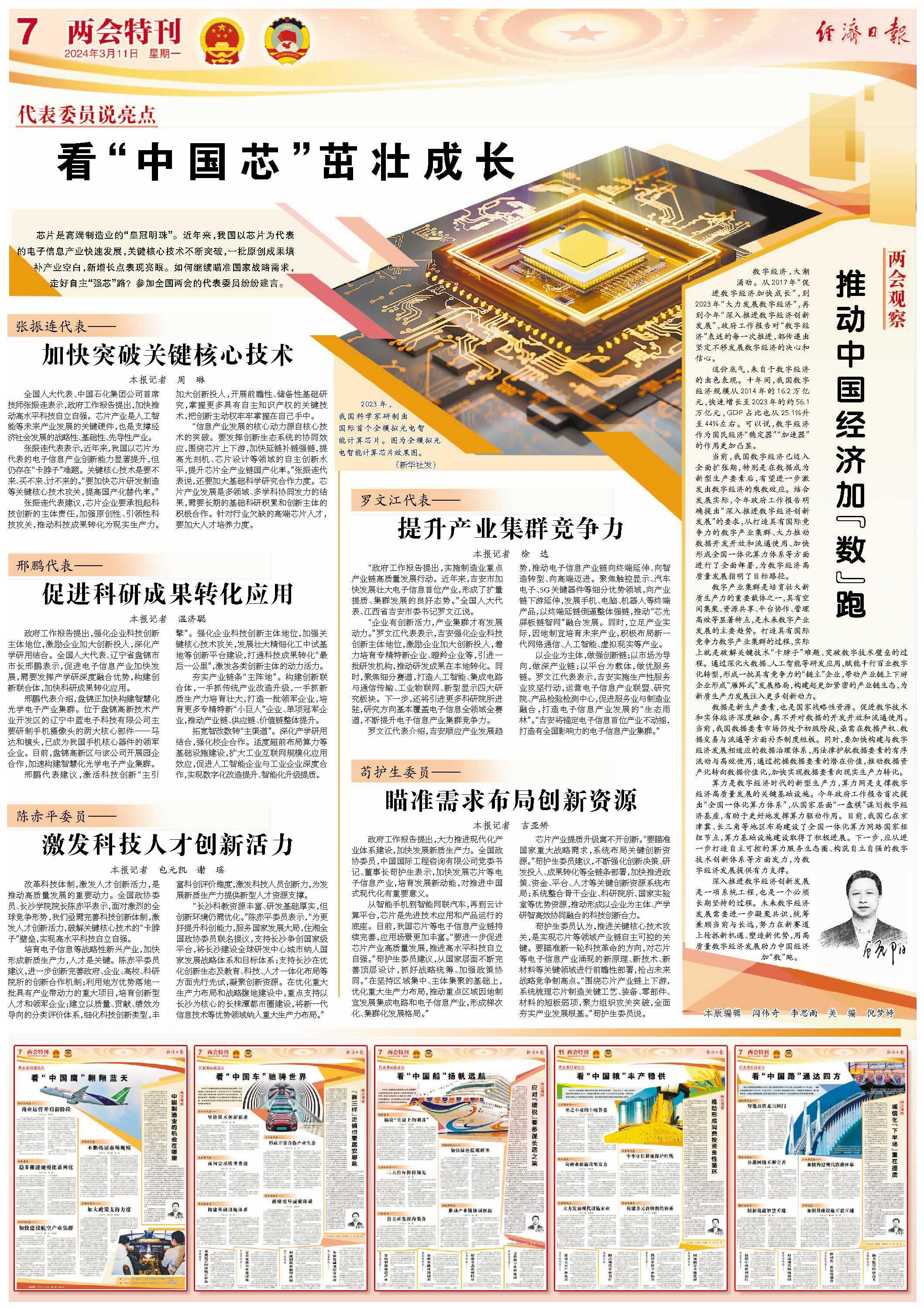 本文刊發(fā)于《經(jīng)濟(jì)日報(bào)》2024年3月11日第7版兩會特刊 政府工作報(bào)告提出,大力推進(jìn)現(xiàn)代化產(chǎn)業(yè)體系建設(shè),加快發(fā)展新質(zhì)生產(chǎn)力。全國政協(xié)委員,中國國際工程咨詢有限公司黨委書記、董事長茍護(hù)生表示,加快發(fā)展芯片等電子信息產(chǎn)業(yè),培育發(fā)展新動(dòng)能,對推進(jìn)中國式現(xiàn)代化有重要意義。 從智能手機(jī)到智能網(wǎng)聯(lián)汽車,再到云計(jì)算平臺,芯片是先進(jìn)技術(shù)應(yīng)用和產(chǎn)品運(yùn)行的底座。目前,我國芯片等電子信息產(chǎn)業(yè)鏈持續(xù)完善,應(yīng)用場景更加豐富。“要進(jìn)一步促進(jìn)芯片產(chǎn)業(yè)高質(zhì)量發(fā)展,推進(jìn)高水平科技自立自強(qiáng)。”茍護(hù)生委員建議,從國家層面不斷完善頂層設(shè)計(jì),抓好戰(zhàn)略統(tǒng)籌、加強(qiáng)政策協(xié)同。“在堅(jiān)持區(qū)域集中、主體集聚的基礎(chǔ)上,優(yōu)化重大生產(chǎn)力布局,推動(dòng)重點(diǎn)區(qū)域因地制宜發(fā)展集成電路和電子信息產(chǎn)業(yè),形成梯次化、集群化發(fā)展格局。” 芯片產(chǎn)業(yè)提質(zhì)升級離不開創(chuàng)新。“要瞄準(zhǔn)國家重大戰(zhàn)略需求,系統(tǒng)布局關(guān)鍵創(chuàng)新資源。”茍護(hù)生委員建議,不斷強(qiáng)化創(chuàng)新決策、研發(fā)投入、成果轉(zhuǎn)化等全鏈條部署,加快推進(jìn)政策、資金、平臺、人才等關(guān)鍵創(chuàng)新資源系統(tǒng)布局;系統(tǒng)整合骨干企業(yè)、科研院所、國家實(shí)驗(yàn)室等優(yōu)勢資源,推動(dòng)形成以企業(yè)為主體、產(chǎn)學(xué)研智高效協(xié)同融合的科技創(chuàng)新合力。 茍護(hù)生委員認(rèn)為,推進(jìn)關(guān)鍵核心技術(shù)攻關(guān),是實(shí)現(xiàn)芯片等領(lǐng)域產(chǎn)業(yè)鏈自主可控的關(guān)鍵。要瞄準(zhǔn)新一輪科技革命的方向,對芯片等電子信息產(chǎn)業(yè)涌現(xiàn)的新原理、新技術(shù)、新材料等關(guān)鍵領(lǐng)域進(jìn)行前瞻性部署,搶占未來戰(zhàn)略競爭制高點(diǎn)。“圍繞芯片產(chǎn)業(yè)鏈上下游,系統(tǒng)梳理芯片制造關(guān)鍵工藝、裝備、零部件、材料的短板弱項(xiàng),聚力組織攻關(guān)突破,全面夯實(shí)產(chǎn)業(yè)發(fā)展根基。”茍護(hù)生委員說。(經(jīng)濟(jì)日報(bào)記者 吉亞矯) | |||||