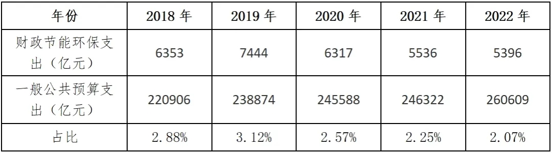 雙碳”目標(biāo)下綠色財(cái)政支出政策研究 姜楠楠 陳少?gòu)?qiáng) 財(cái)政是國(guó)家治理的基礎(chǔ)和重要支柱,生態(tài)環(huán)境作為居民生活最重要的公共產(chǎn)品之一,因其外部性特征向來是財(cái)政資金支持的重點(diǎn)領(lǐng)域。特別是黨的十八大以來,黨中央高度重視生態(tài)文明建設(shè)發(fā)展,提出了一系列具有重大影響和深遠(yuǎn)意義的新理念、新思想、新戰(zhàn)略,財(cái)政部門綜合運(yùn)用財(cái)政補(bǔ)貼、專項(xiàng)資金、轉(zhuǎn)移支付、政府采購(gòu)等方式協(xié)同推進(jìn)生態(tài)環(huán)境質(zhì)量提升。2020年9月,中國(guó)提出二氧化碳排放力爭(zhēng)在2030年前達(dá)到峰值,努力爭(zhēng)取2060年實(shí)現(xiàn)碳中和的“雙碳”目標(biāo),綠色財(cái)政支出持續(xù)發(fā)力,為我國(guó)“雙碳”目標(biāo)實(shí)現(xiàn)發(fā)揮了不可替代的作用。 一、“雙碳”目標(biāo)下的綠色財(cái)政支出特征 (一)綠色財(cái)政支出強(qiáng)度不斷提升 黨的十八大以來,財(cái)政一般公共預(yù)算支出中用于節(jié)能環(huán)保的財(cái)政支出規(guī)模保持平穩(wěn),占一般公共預(yù)算支出比重基本維持在2%-3%之間,持續(xù)支持污染防治、生態(tài)保護(hù)以及節(jié)能減排等項(xiàng)目。具體見下表1: 表1 2018年-2022年全國(guó)一般公共預(yù)算支出中節(jié)能環(huán)保支出及占比情況