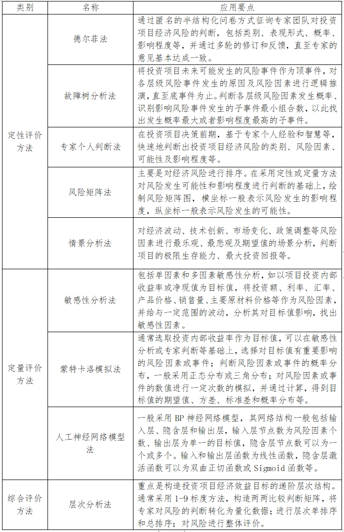 新形勢下投資項目經(jīng)濟(jì)風(fēng)險管控思路研究 劉義成 摘要:投資項目經(jīng)濟(jì)環(huán)境不確定性主要體現(xiàn)在經(jīng)濟(jì)波動、市場變化、技術(shù)創(chuàng)新及政策調(diào)整等方面,對其分析評價需要把握好全面性、系統(tǒng)性、動態(tài)性及定性與定量相結(jié)合原則,并選擇適合的定性、定量和綜合評價方法。隨著投資項目國際國內(nèi)環(huán)境的變化,為增強(qiáng)投資項目應(yīng)對經(jīng)濟(jì)風(fēng)險的風(fēng)險回避、風(fēng)險減輕、風(fēng)險轉(zhuǎn)移和風(fēng)險接受等策略實(shí)施的有效性,應(yīng)強(qiáng)調(diào)經(jīng)濟(jì)分析的基礎(chǔ)性地位,加強(qiáng)內(nèi)外部資源整合,推動風(fēng)險管理的方法和工具創(chuàng)新,完善投資項目經(jīng)濟(jì)風(fēng)險管控措施。 關(guān)鍵詞:投資項目;經(jīng)濟(jì)風(fēng)險;分析評價;管控策略 風(fēng)險可控性是投資項目可行性研究的核心目標(biāo)之一,主要強(qiáng)調(diào)對項目全生命周期包括建設(shè)、運(yùn)營、融資等專項風(fēng)險的識別,對風(fēng)險發(fā)生可能性及影響程度的評估,以及對主要風(fēng)險管控方案和重大風(fēng)險應(yīng)急預(yù)案的制定。從投資項目面臨的內(nèi)外部風(fēng)險因素看,外部因素包括政治、經(jīng)濟(jì)、社會、自然等方面,內(nèi)部因素包括資金、設(shè)計、人員、管理、制度等方面。在全球經(jīng)濟(jì)一體化深入發(fā)展、我國社會主義市場經(jīng)濟(jì)體制不斷完善及現(xiàn)代化企業(yè)制度逐步建立的背景下,未來投資項目全生命周期風(fēng)險管控需要重點(diǎn)加強(qiáng)經(jīng)濟(jì)風(fēng)險的分析評價和應(yīng)對工作。 一、投資項目經(jīng)濟(jì)風(fēng)險的內(nèi)涵及特征 (一)投資項目經(jīng)濟(jì)風(fēng)險的內(nèi)涵及主要類別 1.經(jīng)濟(jì)風(fēng)險內(nèi)涵 國際標(biāo)準(zhǔn)化組織(ISO)發(fā)布的ISO31000:2018《風(fēng)險管理指南》中對風(fēng)險的定義是“不確定性對目標(biāo)的影響”,并進(jìn)一步說明這種影響是與預(yù)期的偏差,包括積極的、消極的或兼而有之。對于投資項目而言,經(jīng)濟(jì)風(fēng)險是指經(jīng)濟(jì)環(huán)境的不確定性對投資項目經(jīng)濟(jì)效益、可持續(xù)發(fā)展等目標(biāo)的影響,主要強(qiáng)調(diào)的是風(fēng)險源或風(fēng)險因素,結(jié)合風(fēng)險事件、可能性及后果等要素共同構(gòu)成完整的風(fēng)險表示。在國際國內(nèi)發(fā)展環(huán)境復(fù)雜多變的新形勢下,投資項目經(jīng)濟(jì)風(fēng)險內(nèi)涵的深刻變化體現(xiàn)在:一是不確定性方面,主要是難以預(yù)測或不可預(yù)測的風(fēng)險事件頻發(fā);二是投資項目的預(yù)期目標(biāo)方面,相較于傳統(tǒng)的對目標(biāo)的不確定性影響分析,更需要強(qiáng)化不確定性分析對形成合理有效投資目標(biāo)的支撐作用;三是影響方面,既要分析損失影響,也要分析可能帶來的收益影響。 2.主要類別 投資項目所處外部經(jīng)濟(jì)環(huán)境的不確定性,主要體現(xiàn)在經(jīng)濟(jì)波動、市場變化、技術(shù)創(chuàng)新及政策調(diào)整等方面,具體如下: 經(jīng)濟(jì)波動。在當(dāng)前大國博弈加劇、地緣政治沖突、經(jīng)濟(jì)制裁頻發(fā)的大環(huán)境下,全球經(jīng)濟(jì)發(fā)展面臨著諸多潛在風(fēng)險,造成投資項目的目標(biāo)確立和風(fēng)險管理愈發(fā)困難。宏觀經(jīng)濟(jì)的波動會造成投資和消費(fèi)的預(yù)期及通貨膨脹率、利率、匯率等產(chǎn)生變化,從而對投資項目的規(guī)模、進(jìn)度、成本、收益等產(chǎn)生直接或間接影響,如在經(jīng)濟(jì)高速增長期,市場需求旺盛,容易產(chǎn)生較高的投資回報預(yù)期,而在經(jīng)濟(jì)下行或進(jìn)入蕭條期,市場需求低迷,營收不及預(yù)期,容易導(dǎo)致資金鏈斷裂,影響項目持續(xù)運(yùn)行。 市場變化。投資項目面臨的市場變化風(fēng)險主要是投入物和產(chǎn)出物的價格和量的波動,在當(dāng)前形勢下,需要重點(diǎn)關(guān)注原材料或其他重要投入物的價格上漲風(fēng)險、產(chǎn)業(yè)鏈供應(yīng)鏈穩(wěn)定風(fēng)險、產(chǎn)品價格下行及需求不足風(fēng)險等。 技術(shù)創(chuàng)新。隨著全球創(chuàng)新步伐加快,新材料、新工藝、新技術(shù)等不斷涌現(xiàn),使得投資項目面臨的技術(shù)環(huán)境不確定因素增多,主要表現(xiàn)在技術(shù)更新?lián)Q代快、技術(shù)轉(zhuǎn)化難度高等方面。投資項目需要不斷加強(qiáng)創(chuàng)新成果的應(yīng)用,才能通過降低生產(chǎn)成本、提高產(chǎn)品質(zhì)量等措施增強(qiáng)產(chǎn)品的市場競爭力,但同時也可能面臨技術(shù)不成熟、技術(shù)轉(zhuǎn)化不成功等帶來的損失風(fēng)險。 政策調(diào)整。現(xiàn)階段,我國正處于以經(jīng)濟(jì)體制改革為牽引推動全面深化改革時期,未來經(jīng)濟(jì)政策主要向著宏觀政策取向一致性、科技創(chuàng)新、高水平對外開放、擴(kuò)大內(nèi)需等方面演變,具體包括產(chǎn)業(yè)政策、財稅政策、金融政策等政策調(diào)整,這些政策調(diào)整可能會對投資項目建設(shè)規(guī)模、技術(shù)路線、融資成本、經(jīng)營成本、稅負(fù)成本等方面產(chǎn)生影響。 (