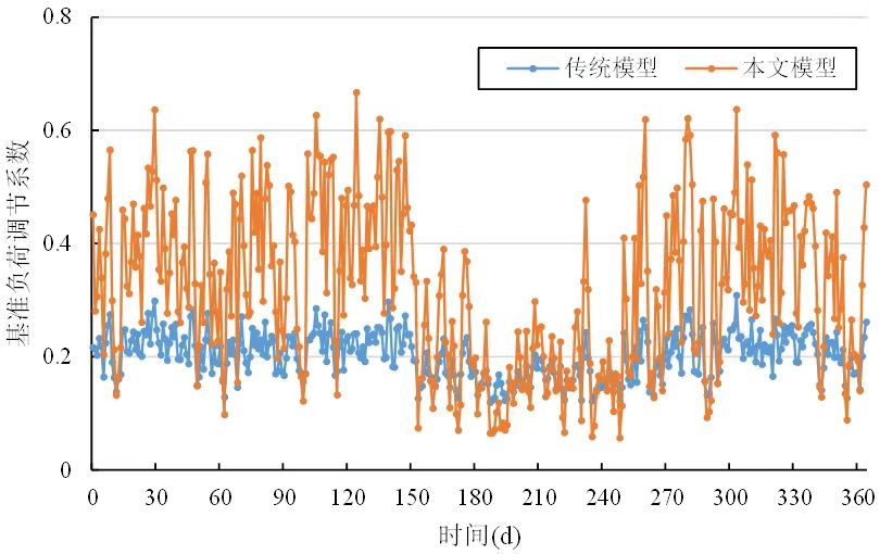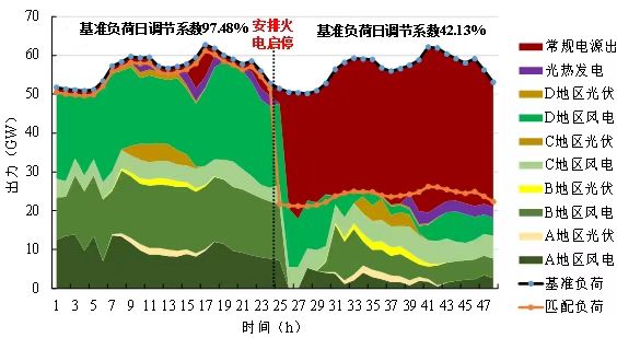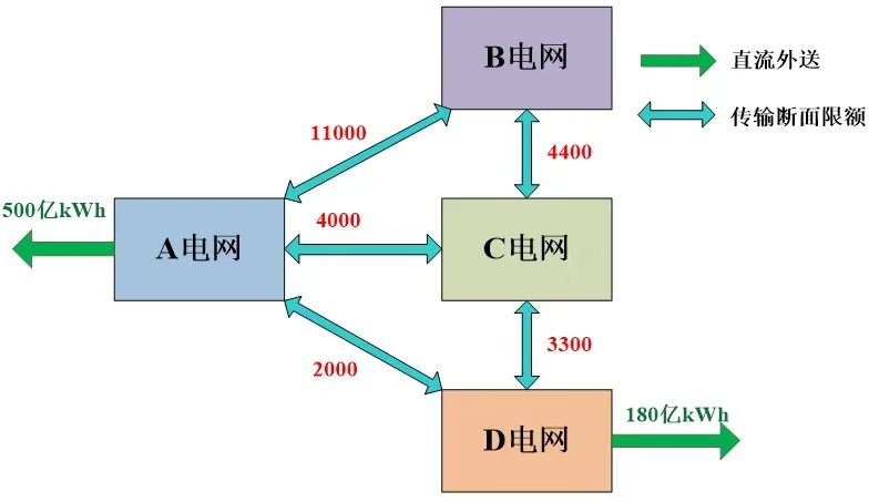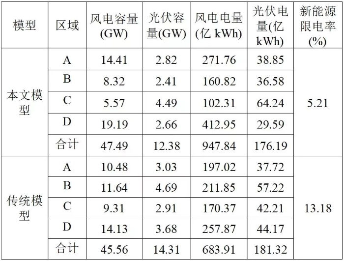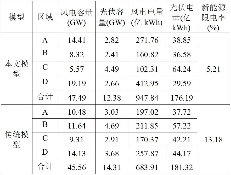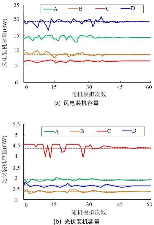 四、算例分析 (一)算例介紹 為驗(yàn)證所提計(jì)及源-荷匹配的新能源優(yōu)化布局方法的正確性,本節(jié)以我國(guó)北方某相鄰四個(gè)(省級(jí))地區(qū)電網(wǎng)為測(cè)試系統(tǒng),研究2030年的新能源規(guī)劃布局問(wèn)題。四個(gè)地區(qū)分布于總面積125萬(wàn)平方公里范圍內(nèi),新能源滲透率達(dá)到30%以上。電網(wǎng)結(jié)構(gòu)圖如圖3所示,A、C電網(wǎng)均分別與其他電網(wǎng)相連,圖中紅色數(shù)字表示各區(qū)域間聯(lián)絡(luò)線限值(單位:MW),綠色數(shù)字為直流外送年電量(單位:億kWh)。算例計(jì)算步長(zhǎng)為1小時(shí),源-荷匹配周期設(shè)為1天,即24h。計(jì)算時(shí)段數(shù)8760h,其余主要算例參數(shù)見表1。本文中規(guī)劃水平年的風(fēng)電、光伏序列是基于該地區(qū)歷史出力序列進(jìn)行新能源出力場(chǎng)景生成得到的,負(fù)荷序列是立足這些地區(qū)2021年的實(shí)際負(fù)荷需求序列,假設(shè)負(fù)荷年增長(zhǎng)率為5%估計(jì)得到的。 圖3 測(cè)試系統(tǒng)等效結(jié)構(gòu)示意圖 表1 算例參數(shù) (二)不同規(guī)劃模型結(jié)果分析 為了驗(yàn)證所提模型可深入挖掘新能源出力互補(bǔ)性,本節(jié)對(duì)比了本文模型和傳統(tǒng)模型的規(guī)劃結(jié)果。其中傳統(tǒng)新模型中不考慮源-荷匹配均衡約束。設(shè)置兩個(gè)仿真案例中光熱接入容量均為3.35GW,風(fēng)電和光伏總裝機(jī)為59.87GW,所得結(jié)果如表2所示。 可以看出,對(duì)比傳統(tǒng)方法,考慮源-荷匹配后,本文模型所得D地區(qū)風(fēng)電和C地區(qū)光伏最優(yōu)布局容量分別增長(zhǎng)了35.81%和54.3%。從風(fēng)電和光伏總裝機(jī)方面看,本文模型所得風(fēng)電總?cè)萘枯^傳統(tǒng)方法高4.24%,這表明考慮源-荷匹配后,系統(tǒng)更傾向于配置互補(bǔ)性更好的風(fēng)電,光伏由于出力形狀較為固定,容量越大越難以實(shí)現(xiàn)源-荷匹配。此外,在新能源總裝機(jī)一致的情況下,本文模型得到的新能源年度總出力電量為1124.03億kWh,而傳統(tǒng)模型所得新能源年度總出力電量為865.23億kWh,前者相較后者提升29.91%,即考慮源-荷匹配可使新能源滲透率從28.51%增加至37.04%。從新能源限電方面看,考慮源-荷匹配可使新能源總限電率從傳統(tǒng)模型的23.18%降低至本文模型的5.21%。可以看出,在同樣的裝機(jī)總?cè)萘肯拢紤]源-荷匹配可以充分提升新能源消納能力,減少棄風(fēng)、棄光情況。 表2 不同模型規(guī)劃結(jié)果 圖4 不同模型的年度基準(zhǔn)負(fù)荷調(diào)節(jié)系數(shù) 圖4顯示的是求解兩種模型所得的年度基準(zhǔn)負(fù)荷調(diào)節(jié)系數(shù),該參數(shù)描述的是每個(gè)匹配周期內(nèi)新能源總出力占基準(zhǔn)負(fù)荷的比例,其數(shù)值越高,說(shuō)明新能源出力在系統(tǒng)總出力中占比越高。可以看出,本文模型中年度基準(zhǔn)負(fù)荷調(diào)節(jié)系數(shù)變化范圍為0-0.7,平均值為0.32;傳統(tǒng)模型的年度基準(zhǔn)負(fù)荷調(diào)節(jié)系數(shù)變化范圍為0.1-0.3,平均值為0.2。本文模型所得基準(zhǔn)負(fù)荷調(diào)節(jié)系數(shù)更高,有利于提升新能源消納水平。 綜上可得,采用本文方法考慮源-荷匹配均衡約束可以深入挖掘新能源出力互補(bǔ)性,有利于提升新能源消納水平,促進(jìn)新能源產(chǎn)業(yè)健康發(fā)展。 (三)靈活性新能源電源接入對(duì)規(guī)劃結(jié)果的影響 為了研究靈活性新能源電源接入系統(tǒng)對(duì)多區(qū)域新能源優(yōu)化規(guī)劃布局的影響,本節(jié)設(shè)置風(fēng)/光組合和風(fēng)/光/光熱組合兩類場(chǎng)景,分別計(jì)算兩類場(chǎng)景下的多能源電力系統(tǒng)容量規(guī)劃結(jié)果。令風(fēng)/光組合光伏裝機(jī)容量與風(fēng)/光/光熱組合光伏與光熱總裝機(jī)容量相等。其余約束條件和計(jì)算邊界均一致。計(jì)算結(jié)果如表3所示。 表3 不同場(chǎng)景下的規(guī)劃結(jié)果 可以看出,在新能源總裝機(jī)容量一定下,風(fēng)/光/光熱組合的源-荷匹配一致性指標(biāo)為0.080,而風(fēng)/光組合的源-荷匹配一致性指標(biāo)為0.098。由該指標(biāo)定義可知,越小,說(shuō)明在該時(shí)段內(nèi)新能源出力與負(fù)荷功率變化趨勢(shì)越接近,源-荷匹配程度越高。此外,風(fēng)/光/光熱組合的新能源出力與負(fù)荷波動(dòng)形狀的年度平均絕對(duì)偏差與風(fēng)/光組合相比降低52.27%,新能源基本不增加電網(wǎng)調(diào)峰難度,同時(shí)風(fēng)/光/光熱組合的新能源總發(fā)電量比風(fēng)/光組合高4.03%,因此可得出結(jié)論:靈活性新能源電源的接入對(duì)提高源-荷匹配具有積極作用。 圖5 不同場(chǎng)景下源-荷匹配效果 圖5所示為兩種場(chǎng)景下新能源出力與負(fù)荷匹配效果對(duì)比,圖中同色系深色表示匹配偏差最大日結(jié)果,淺色表示匹配偏差最小日結(jié)果。當(dāng)新能源總裝機(jī)容量一定時(shí),從匹配效果方面看,四個(gè)地區(qū)的風(fēng)/光組合和風(fēng)/光/光熱組合均可以在一定程度上實(shí)現(xiàn)新能源總出力與負(fù)荷形狀的優(yōu)化匹配,可大幅降低電網(wǎng)的調(diào)峰難度。風(fēng)/光組合的匹配效果不及風(fēng)/光/光熱組合,這說(shuō)明靈活電源的接入有利于源-荷匹配互補(bǔ)。從匹配偏差方面看,風(