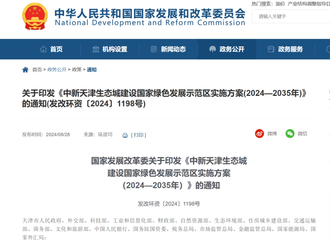 發(fā)揮中新合作平臺(tái)優(yōu)勢(shì) 高標(biāo)準(zhǔn)高質(zhì)量建設(shè)國(guó)家綠色發(fā)展示范區(qū) ——《中新天津生態(tài)城建設(shè)國(guó)家綠色發(fā)展示范區(qū)實(shí)施方案(2024—2035年)》解讀 朱黎陽(yáng) 范瑩瑩 近日,經(jīng)國(guó)務(wù)院批復(fù)同意,國(guó)家發(fā)展改革委印發(fā)《中新天津生態(tài)城建設(shè)國(guó)家綠色發(fā)展示范區(qū)實(shí)施方案(2024—2035年)》(發(fā)改環(huán)資〔2024〕1198號(hào),以下簡(jiǎn)稱《方案》),立足新形勢(shì)新要求,從多個(gè)維度對(duì)下一階段中新天津生態(tài)城(以下簡(jiǎn)稱生態(tài)城)建設(shè)國(guó)家綠色發(fā)展示范區(qū)升級(jí)版的目標(biāo)任務(wù)作出了全面系統(tǒng)部署。 01、《方案》是新征程上生態(tài)城綠色發(fā)展的施工圖 2013年,生態(tài)城成為首個(gè)國(guó)家綠色發(fā)展示范區(qū)。2013年5月,習(xí)近平總書(shū)記在生態(tài)城視察時(shí)強(qiáng)調(diào),“生態(tài)城要兼顧好先進(jìn)性、高端化和能復(fù)制、可推廣兩個(gè)方面,在體現(xiàn)人與人、人與經(jīng)濟(jì)活動(dòng)、人與環(huán)境和諧共存等方面作出有說(shuō)服力的回答,為建設(shè)資源節(jié)約型、環(huán)境友好型社會(huì)提供示范”。十多年以來(lái),生態(tài)城認(rèn)真貫徹落實(shí)習(xí)近平總書(shū)記對(duì)天津及生態(tài)城的重要指示精神,全力推動(dòng)國(guó)家綠色發(fā)展示范區(qū)建設(shè)取得豐碩成果,從鹽堿荒灘蛻變成生態(tài)之城、智慧之城、幸福之城,成為生態(tài)文明建設(shè)的示范區(qū)、綠色發(fā)展體制機(jī)制的創(chuàng)新區(qū)和綠色思想文化的策源地。 在新征程的新起點(diǎn)上,《方案》提出了生態(tài)城新十年建設(shè)國(guó)家綠色發(fā)展示范區(qū)“3+20”的任務(wù)目標(biāo)體系。確立了綠色發(fā)展的三項(xiàng)示范任務(wù),一是要在綠色低碳產(chǎn)業(yè)效益上發(fā)揮先導(dǎo)帶動(dòng)作用,形成具有國(guó)際競(jìng)爭(zhēng)優(yōu)勢(shì)的綠色低碳產(chǎn)業(yè)集群,單位地區(qū)生產(chǎn)總值二氧化碳排放水平保持領(lǐng)先;二是在綠色低碳創(chuàng)新能力上發(fā)揮先行引領(lǐng)作用,培育一批綠色低碳技術(shù)創(chuàng)新載體和平臺(tái),取得一批綠色低碳技術(shù)知識(shí)產(chǎn)權(quán),形成綠色低碳高質(zhì)量發(fā)展技術(shù)和標(biāo)準(zhǔn)支撐體系;三是在綠色低碳開(kāi)放合作上發(fā)揮重要牽引作用,打造產(chǎn)業(yè)合作、技術(shù)轉(zhuǎn)移、人才培養(yǎng)平臺(tái),建設(shè)綠色低碳領(lǐng)域國(guó)際合作重要樞紐。同時(shí),《方案》還結(jié)合生態(tài)城發(fā)展實(shí)際,提出了20項(xiàng)具體指標(biāo),部分指標(biāo)達(dá)到國(guó)際領(lǐng)先水平,比如,單位GDP二氧化碳排放量,我國(guó)的平均水平約1噸二氧化碳/萬(wàn)元,發(fā)達(dá)國(guó)家水平約為0.2噸二氧化碳/萬(wàn)元,生態(tài)城目前是0.27噸二氧化碳/萬(wàn)元,2035年目標(biāo)值是0.2噸二氧化碳/萬(wàn)元以下。此外,還有一些指標(biāo)也具有較強(qiáng)的先進(jìn)性,比如,到2035年,研發(fā)經(jīng)費(fèi)投入強(qiáng)度翻倍,綠電占全社會(huì)用電量比重達(dá)到近100%。這些任務(wù)和指標(biāo)不僅體現(xiàn)了國(guó)家對(duì)生態(tài)城未來(lái)發(fā)展的高要求,也彰顯了生態(tài)城在綠色發(fā)展領(lǐng)域的國(guó)際視野和雄心壯志。 當(dāng)前,我國(guó)已經(jīng)開(kāi)啟全面建設(shè)社會(huì)主義現(xiàn)代化國(guó)家新征程,我們要建設(shè)的現(xiàn)代化是人與自然和諧共生的現(xiàn)代化,要加快經(jīng)濟(jì)社會(huì)發(fā)展全面綠色轉(zhuǎn)型。8月11日,中共中央、國(guó)務(wù)院印發(fā)《關(guān)于加快經(jīng)濟(jì)社會(huì)發(fā)展全面綠色轉(zhuǎn)型的意見(jiàn)》,提出將綠色轉(zhuǎn)型的要求融入經(jīng)濟(jì)社會(huì)發(fā)展全局,全方位、全領(lǐng)域、全地域推進(jìn)綠色轉(zhuǎn)型,形成節(jié)約資源和保護(hù)環(huán)境的空間格局、產(chǎn)業(yè)結(jié)構(gòu)、生產(chǎn)方式、生活方式。《方案》立足新形勢(shì)新要求,深入貫徹黨的二十大和二十屆二中、三中全會(huì)精神,認(rèn)真貫徹習(xí)近平生態(tài)文明思想,重新布局生態(tài)城綠色發(fā)展的目標(biāo)任務(wù),提出打造以綠色低碳高質(zhì)量發(fā)展為主線、以高附加值細(xì)分產(chǎn)業(yè)為重點(diǎn)、以國(guó)際一流營(yíng)商環(huán)境為特征的國(guó)家綠色發(fā)展示范區(qū),推動(dòng)綠色發(fā)展理念融入生態(tài)城經(jīng)濟(jì)社會(huì)發(fā)展各領(lǐng)域全過(guò)程,為加快經(jīng)濟(jì)社會(huì)發(fā)展全面綠色轉(zhuǎn)型探索新路徑。 02、《方案》充分發(fā)揮中新合作平臺(tái)優(yōu)勢(shì),建設(shè)綠色低碳開(kāi)放合作的新高地 黨的二十屆三中全會(huì)提出,開(kāi)放是中國(guó)式現(xiàn)代化的鮮明標(biāo)識(shí)。必須堅(jiān)持對(duì)外開(kāi)放基本國(guó)策,堅(jiān)持以開(kāi)放促改革,依托我國(guó)超大規(guī)模市場(chǎng)優(yōu)勢(shì),在擴(kuò)大國(guó)際合作中提升開(kāi)放能力,建設(shè)更高水平開(kāi)放型經(jīng)濟(jì)新體制。生態(tài)城作為中國(guó)和新加坡兩國(gu