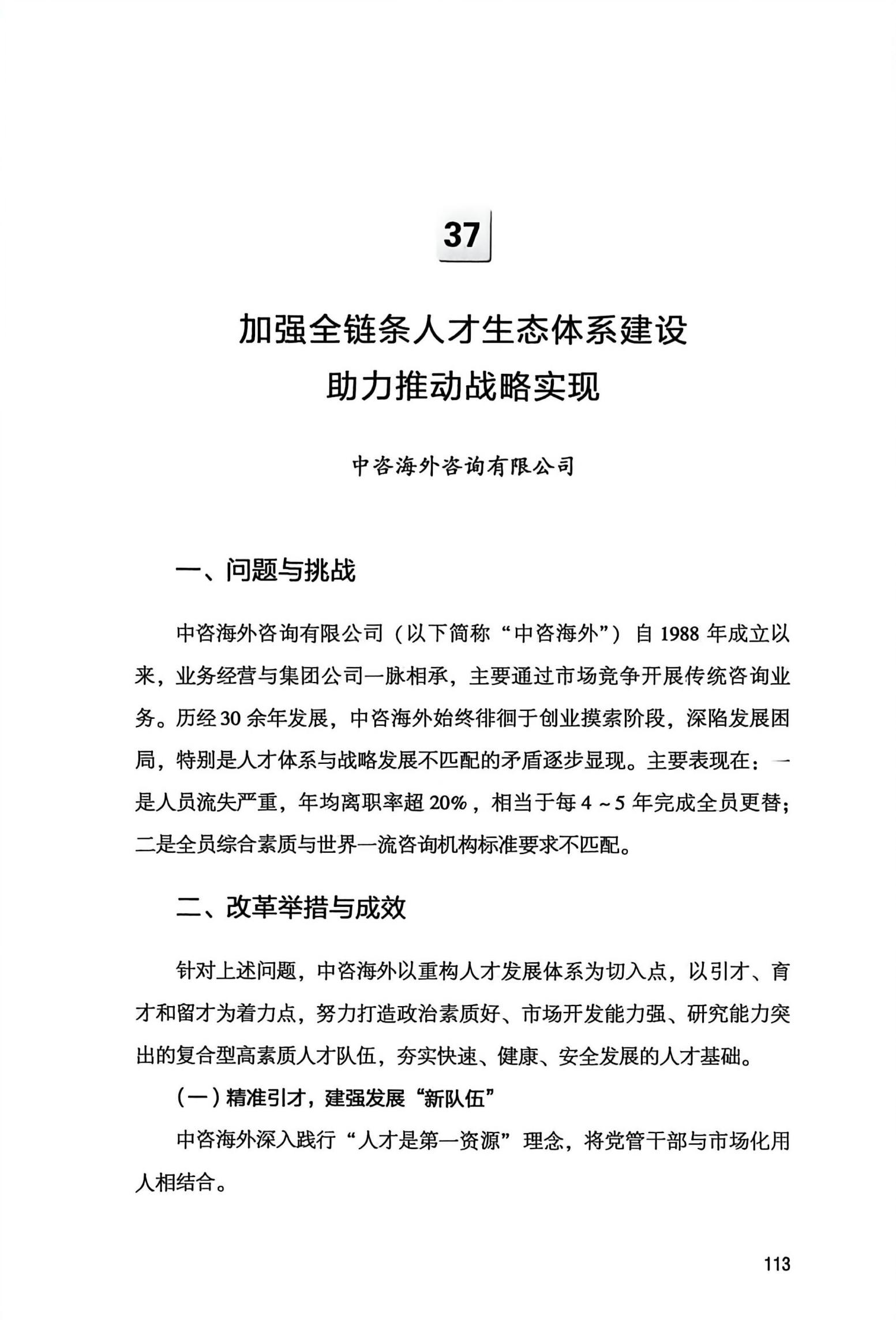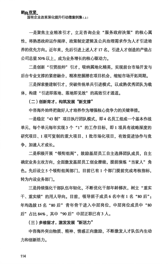 近日,國務(wù)院國資委發(fā)布國資國企改革經(jīng)驗案例叢書——《靶向攻堅:國有企業(yè)改革深化提升行動微案例集》。中咨公司報送的所屬中咨海外咨詢有限公司(以下簡稱海外公司)實踐案例《加強全鏈條人才生態(tài)體系建設(shè) 助力推動戰(zhàn)略實現(xiàn)》成功入選。