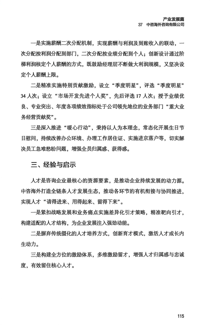近年來,中咨公司黨委堅決貫徹落實黨中央、國務(wù)院關(guān)于深化國企改革的決策部署,按照國務(wù)院國資委黨委工作要求,扎實推進改革深化提升行動,聚焦建設(shè)國家高端智庫和世界一流咨詢機構(gòu)戰(zhàn)略目標(biāo),在增強服務(wù)國家戰(zhàn)略功能作用、完善市場化運營機制、推動業(yè)務(wù)轉(zhuǎn)型發(fā)展、鞏固提升咨詢能力等方面取得了明顯成效。特別是在推進基層改革創(chuàng)新方面,持續(xù)加大力度,加強政策引導(dǎo)、強化精準(zhǔn)對接、深化業(yè)務(wù)賦能,充分激發(fā)基層企業(yè)改革創(chuàng)新的主動性積極性,加快培育具有咨詢行業(yè)特色的改革尖兵。 作為第一批“雙百企業(yè)”,海外公司將深化改革作為轉(zhuǎn)型發(fā)展的有力抓手,持續(xù)完善內(nèi)部管控機制,完善現(xiàn)代企業(yè)治理制度,健全市場化經(jīng)營機制,形成了一批重點咨詢項目和重大課題研究成果,經(jīng)營質(zhì)量和效益持續(xù)攀升,改革成效顯著提升。海外公司以此次微案例征集工作為契機,聚焦人才隊伍建設(shè)這一關(guān)鍵領(lǐng)域,以引才、育才和留才為著力點,全面梳理人才生態(tài)體系建設(shè)方面的實踐經(jīng)驗和改革成效,形成了可復(fù)制、可推廣的有效做法,得到上級單位高度評價。截至目前,海外公司已連續(xù)四年獲評國企改革“雙百標(biāo)桿”稱號。 下一步,公司將深入貫徹落實習(xí)近平總書記對中央企業(yè)工作作出的重要指示精神,按照國務(wù)院國資委黨委各項部署要求,持續(xù)深化改革攻堅,深入做好規(guī)劃編制、智庫建設(shè)、業(yè)務(wù)發(fā)展、風(fēng)險防范等重點工作,確保“十五五”開好局、起好步,努力推動公司改革發(fā)展取得更大成效。